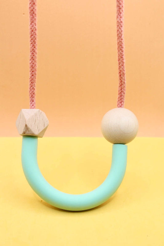 Mint Silicone U Tube necklace on 5mm Pink Macrame Cord | Chunky Wooden Beads