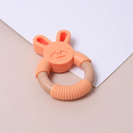 Bunny-Shaped Peach Pink Silicone & Beechwood Baby Teether | Tactile & Safe